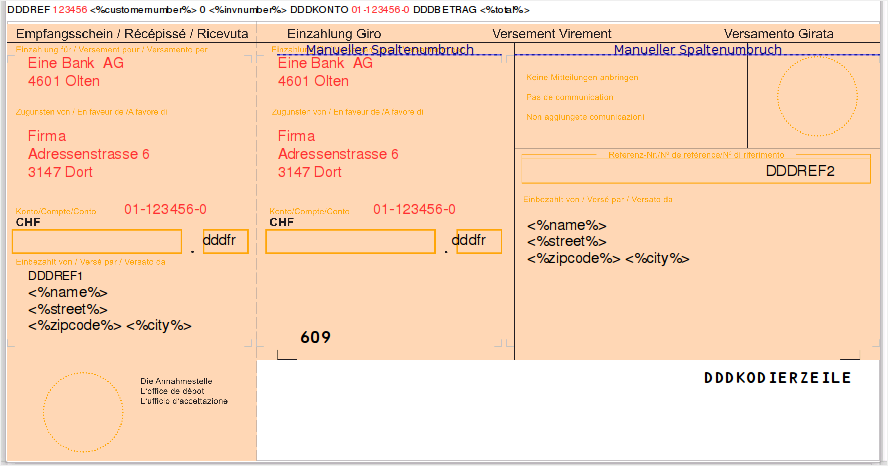 Im Einzahlungsschein selbst müssen der Name und die Adresse der Bank, die Postkonto-Nummer der Bank, sowie der eigene Firmenname und die Firmenadresse angepasst werden. Dabei ist darauf zu achten, dass sich die Positionen der Postkonto-Nummern der Bank, sowie der Zeichenfolgen dddfr, DDDREF1, DDDREF2, 609, DDDKODIERZEILE nicht verschieben.