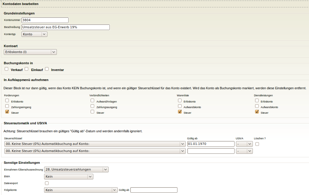 Die Umsatzsteuerumstellung auf 19% für SKR04 für die Steuerschlüssel "EU ohne USt-ID Nummer" ist erst 2010 erfolgt. odyn beinhaltet ein Upgradeskript, das das Konto 3804 automatisch erstellt und die Steuereinstellungen korrekt einstellt. Hat der Benutzer aber schon selber das Konto 3804 angelegt, oder gab es schon Buchungen im Zeitraum nach dem 01.01.2007 auf das Konto 3803, wird das Upgradeskript vorsichtshalber nicht ausgeführt, da der Benutzer sich vielleicht schon selbst geholfen hat und mit seinen Änderungen zufrieden ist. Die korrekten Einstellungen kann man aber auch per Hand ausführen. Nachfolgend werden die entsprechenden Schritte anhand von Screenshots dargestellt.