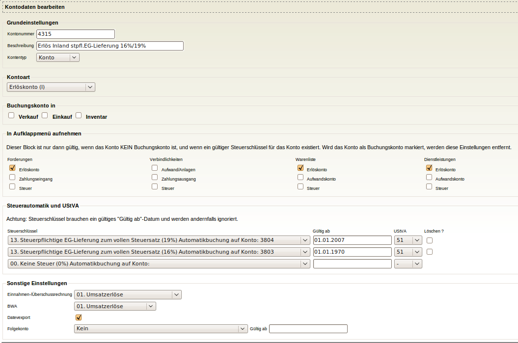Als Nächstes sind alle Konten anzupassen, die als Steuerautomatikkonto die 3803 haben, sodass sie ab dem 1.1.2007 auch Steuerautomatik auf 3804 bekommen. Dies betrifft in der Standardkonfiguration die Konten 4315 und 4726. Als Beispiel für 4315 müssen Sie dazu unter → → das Konto 4315 anklicken und die Einstellungen wie im Screenshot gezeigt vornehmen.