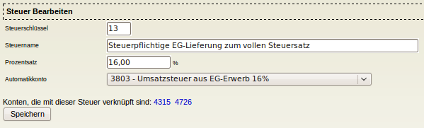 Als Zweites muss Steuergruppe 13 für Konto 3803 angepasst werden. Dazu unter → → den Eintrag mit Steuerschlüssel 13 auswählen und ihn wie im folgenden Screenshot angezeigt anpassen.